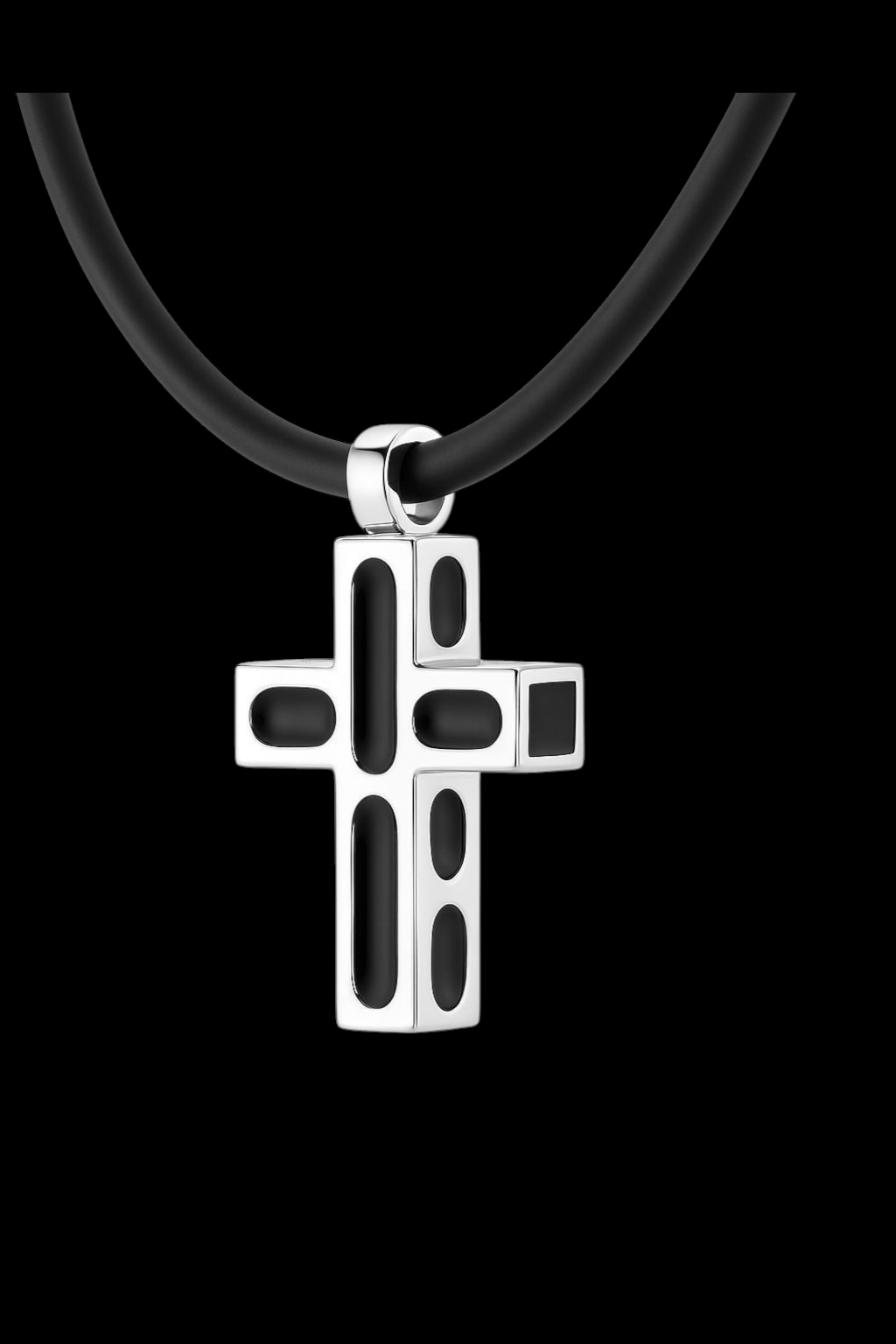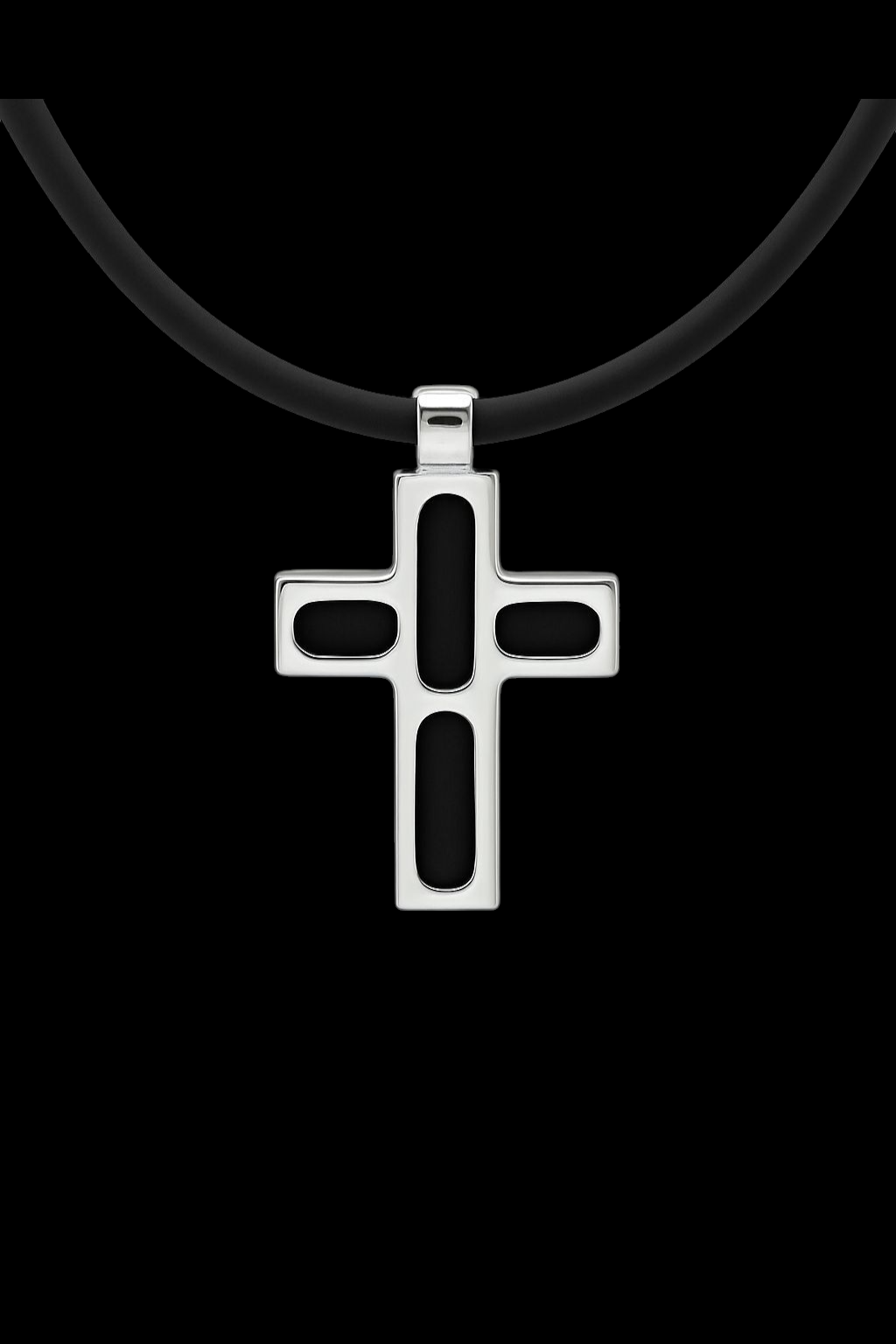 A bold symbol of strength and style, this men’s cross pendant features a sleek design that blends modern simplicity with timeless elegance. Crafted from premium 316 stainless steel. hotsteel Collection pendant showcases a polished silver finish with smooth black rubber inlays that create striking contrast and depth. Suspended from a durable matte black rubber cord, it’s designed for both comfort and sophistication ideal for daily wear or evening attire. The clean, refined lines make it a versatile accessory that complements any look.