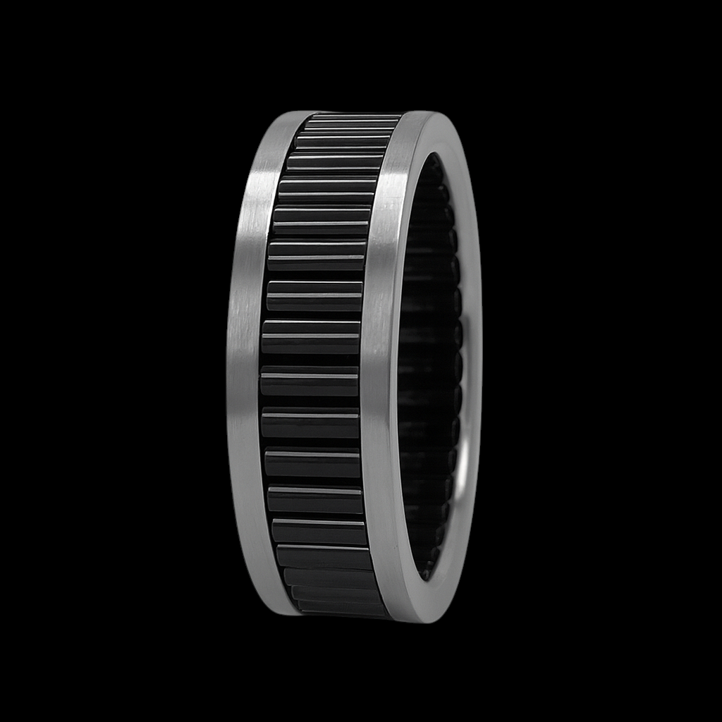 Crafted for the modern man, this ring is not only stylish but also built to last. Its rugged yet sophisticated look makes it a timeless accessory that complements any outfit, from everyday street wear to tailored suits. This men’s stainless-steel ring combines modern design with industrial strength. The brushed silver outer edges frame a bold black round enridged barrels inlay, creating a striking contrast that stands out with confidence and style.