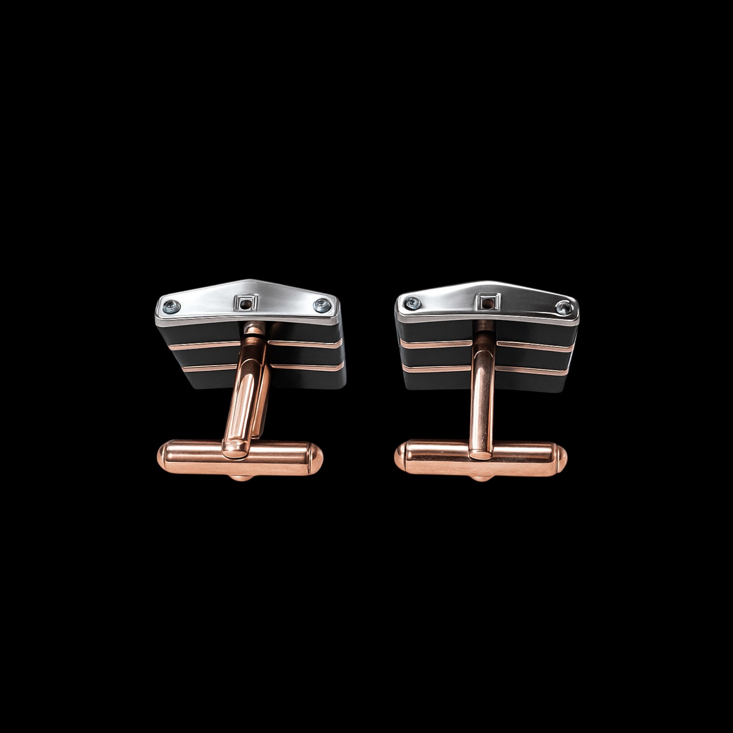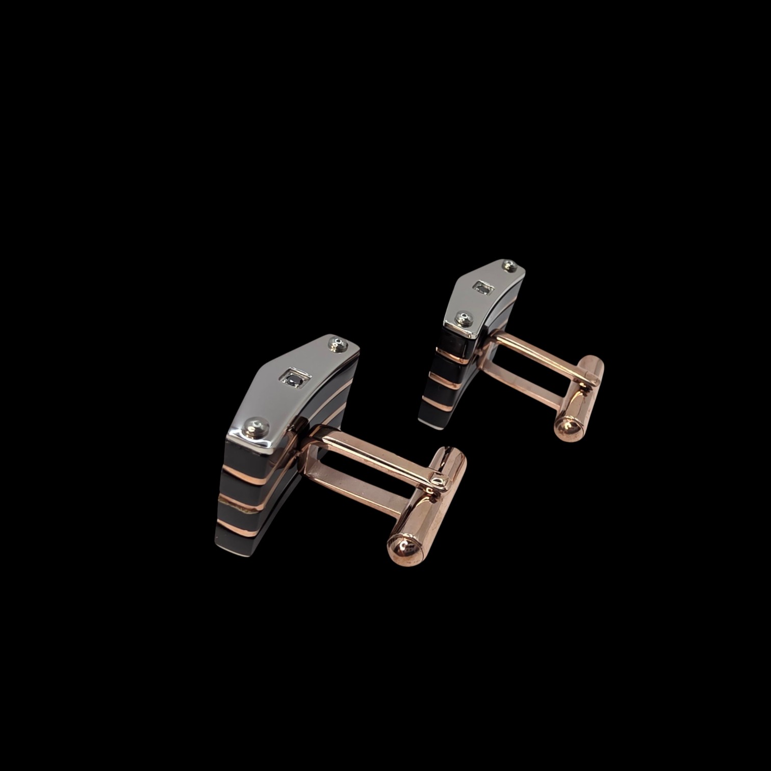 Crafted from premium 316 marine grade stainless steel, these cufflinks combine strength with refined style. The bold, layered design features rich onyx inlays, accented with rose gold detailing for a striking contrast. Each cufflink is finished with a precisely set black diamond, adding a subtle touch of luxury.