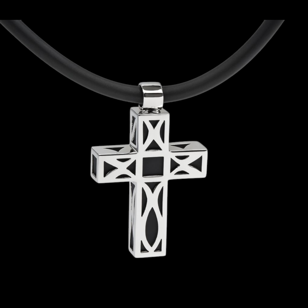 hotsteel Collection is crafted from 316 marine-grade stainless steel, this pendant has craftsmanship and modern elegance. Its geometric cross design features precision-cut details with a sleek black rubber inlay, creating a powerful contrast between light and shadow. The pendant is paired with a black rubber choker and a German-engineered stainless-steel clasp for a secure and comfortable fit. Designed for the modern man who values strength, style, and individuality. Designed for durability and modern masculine appeal. Hypoallergenic, corrosion resistant, and tarnish-free. Weight-balanced for daily comfort