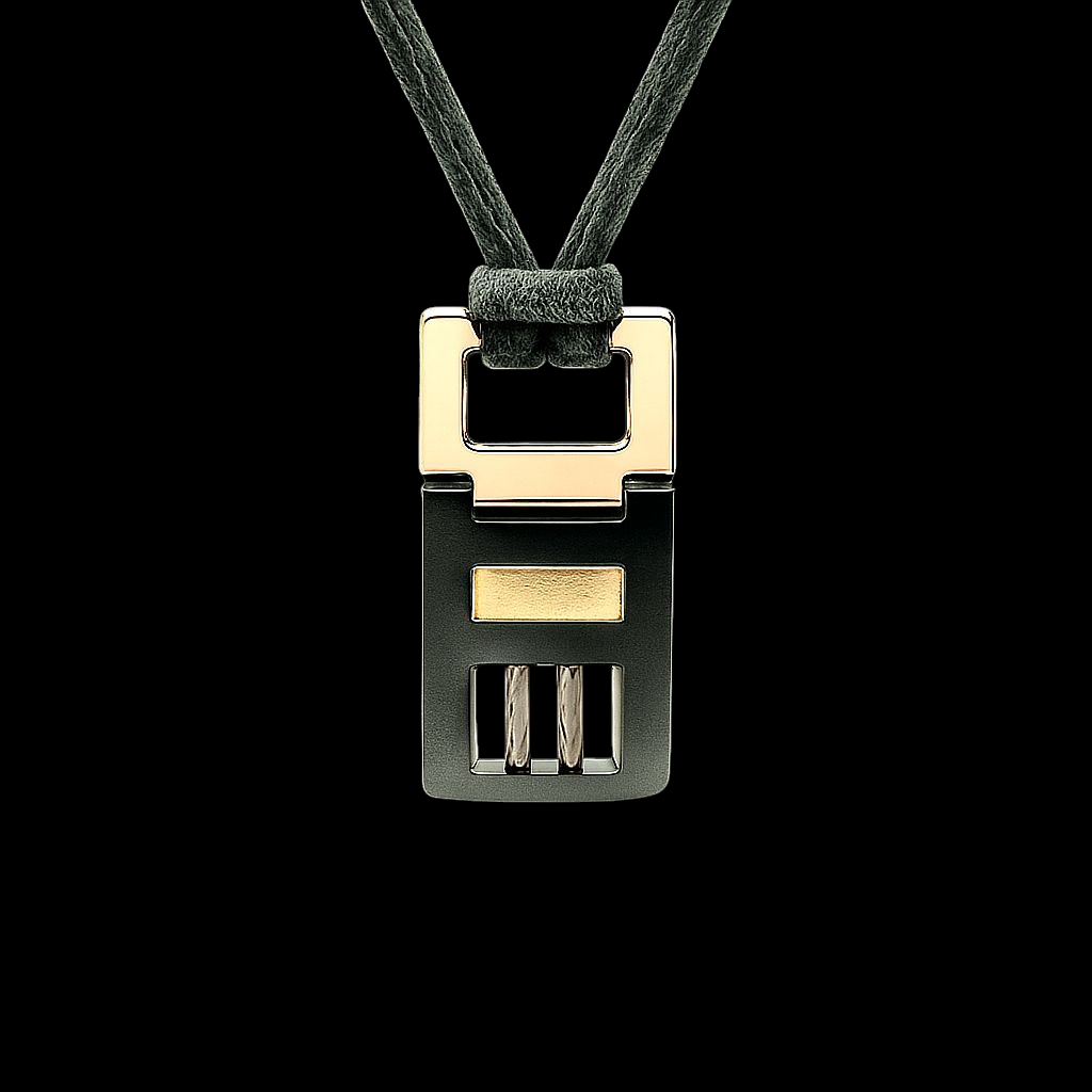 A modern industrial inspired design crafted from 316 marine grade stainless steel, this hotsteel Collection pendant combines strength with subtle elegance. The piece features a dual tone finish with polished silver and brushed black accents, highlighted by a gold center panel. Suspended on a black Japanese cotton cord, it delivers both comfort and durability a true reflection of contemporary masculine style. Pendant is hypoallergenic and corrosion resistant.