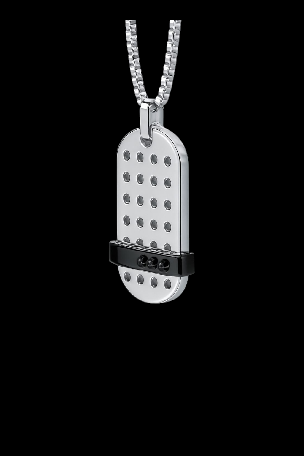 Bold and modern, this hotsteel pendant is engineered from high grade 316 stainless steel with a polished perforated face set with black diamonds. A rose gold–tone accent band adds refined contrast, suspended on a durable stainless steel box chain. Designed for everyday wear, it delivers a clean, masculine aesthetic with a confident industrial edge.