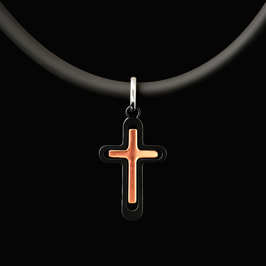 This sophisticated men’s cross pendant blends faith, strength, and modern design. Crafted from 316 marine grade stainless steel, it offers superior durability and resistance to tarnish or corrosion. The pendant features a two tone design  a sleek black outer frame paired with a rose gold center cross, creating a striking contrast of power and elegance. Finished with a brushed metallic surface and suspended from a black rubber cord, it’s a perfect balance of style, resilience, and meaning  ideal for the modern, confident man.