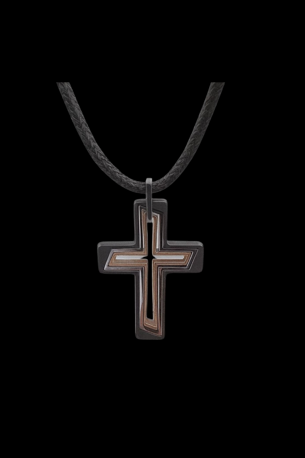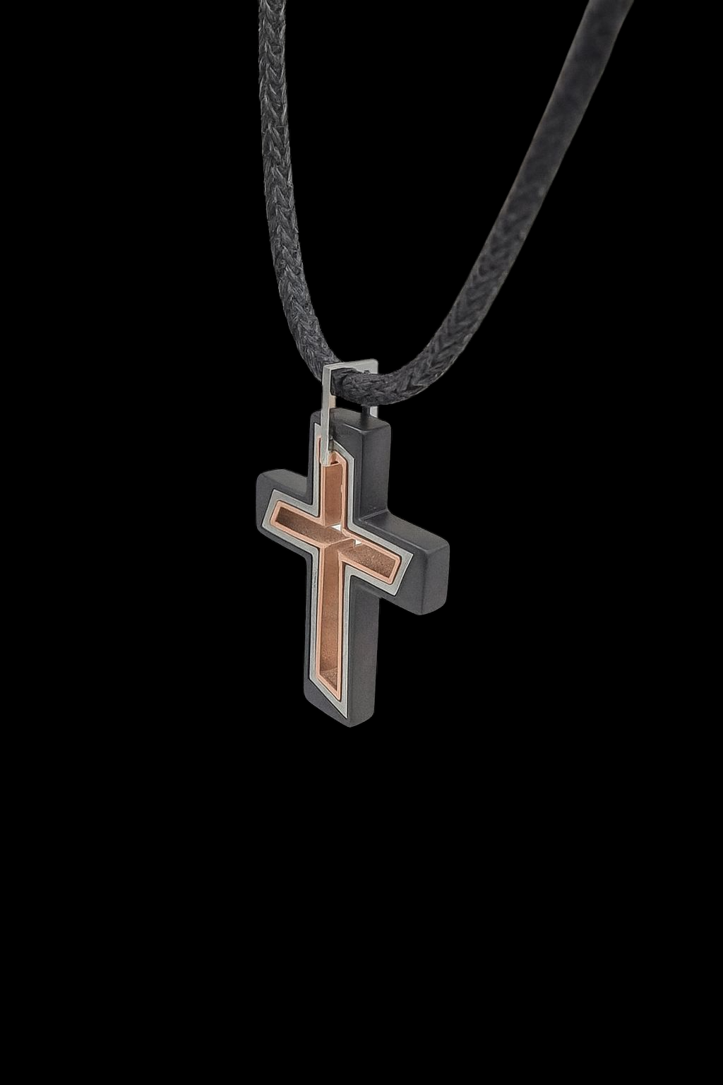 This contemporary men’s cross pendant combines bold design with refined craftsmanship. Made from marine grade 316 stainless steel, hotsteel Collection features a matte black outer frame contrasted by sleek steel and rose-gold layered accents that add depth and sophistication. Paired with a durable black Japanese cotton card, this pendant embodies strength, faith, and modern style perfect for both casual and formal wear. Its polished edges and clean lines make it a timeless accessory for the modern man.
